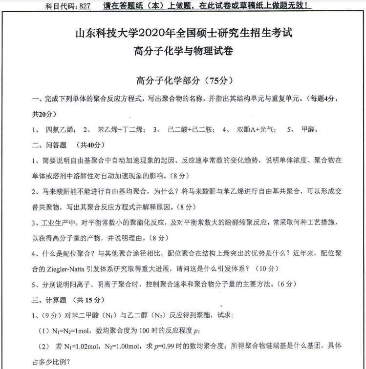 拼搏在线官网真题:山东科技拼搏(中国)827高分子化学与物理2020年硕士研究生自命题试题”的全部内容!更多真题资料请关注“拼搏在线官网