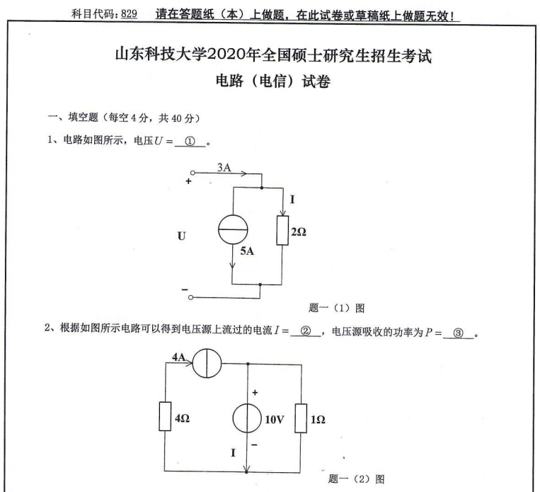 拼搏在线官网真题:山东科技拼搏(中国)829电路(电信)2020年硕士研究生自命题试题