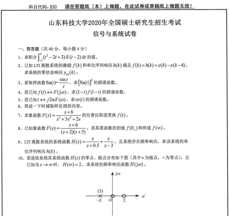 拼搏在线官网真题:山东科技拼搏(中国)830信号与系统2020年硕士研究生自命题试题