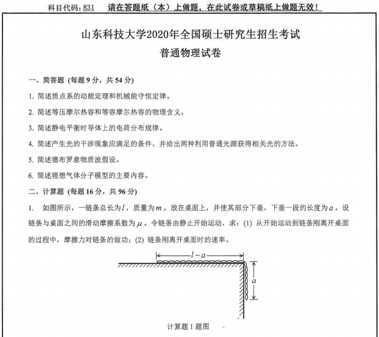 拼搏在线官网真题:山东科技拼搏(中国)831普通物理2020年硕士研究生自命题试题
