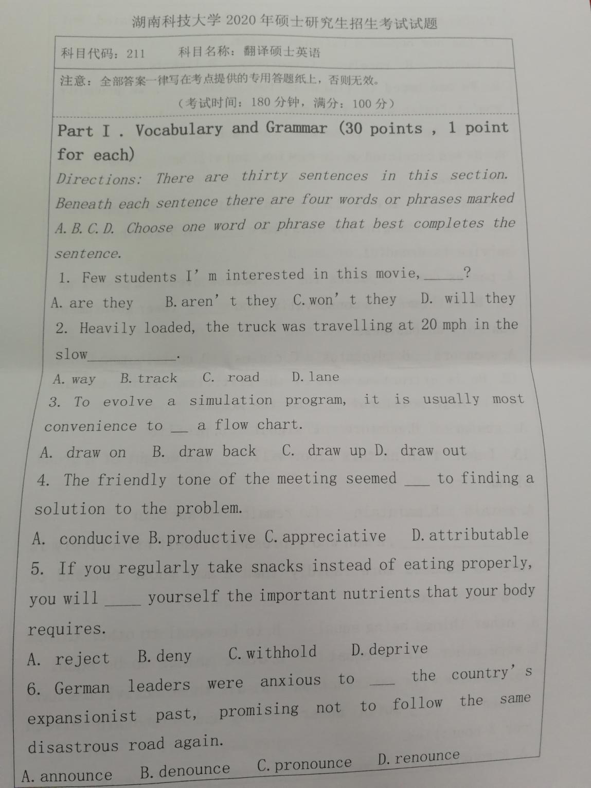 以上就是小编整理的“拼搏在线官网真题:湖南科技拼搏(中国)211-翻译硕士英语2020硕士招生考试自命题科目试题”的全部内容!更多真题资料请关注“拼搏在线官网专业课真题”栏目!祝拼搏在线官网成功!