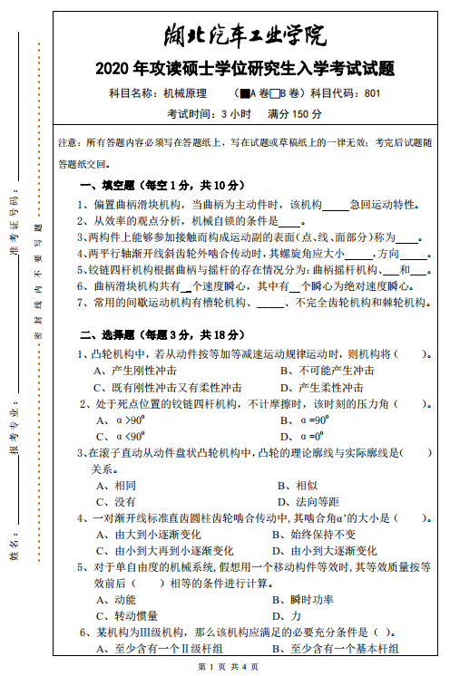 以上就是小编整理的“拼搏在线官网真题:湖北汽车工业学院801机械原理2020年攻读硕士学位研究生招生入学考试试题”的全部内容!更多真题资料请关注“拼搏在线官网专业课真题”栏目!祝拼搏在线官网成功!