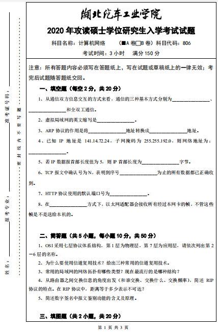 以上就是小编整理的“拼搏在线官网真题:湖北汽车工业学院806计算机网络2020年攻读硕士学位研究生招生入学考试试题”的全部内容!更多真题资料请关注“拼搏在线官网专业课真题”栏目!祝拼搏在线官网成功!