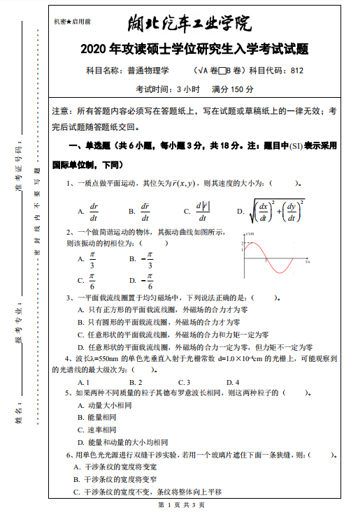 以上就是小编整理的“拼搏在线官网真题:湖北汽车工业学院812普通物理学2020年攻读硕士学位研究生招生入学考试试题”的全部内容!更多真题资料请关注“拼搏在线官网专业课真题”栏目!祝拼搏在线官网成功!