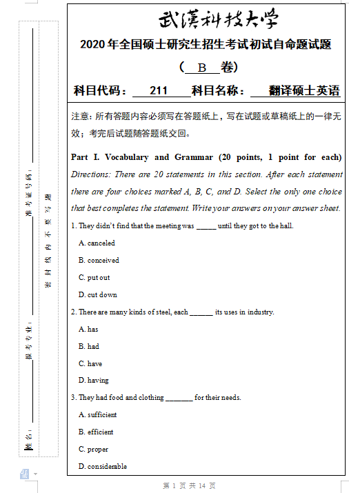 拼搏在线官网真题:武汉科技拼搏(中国)211翻译硕士英语2020年硕士研究生招生考试初试自命题试题
