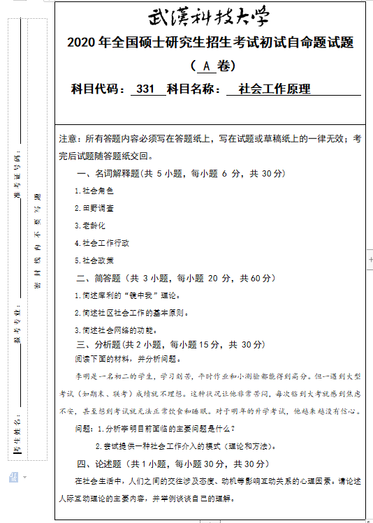拼搏在线官网真题:武汉科技拼搏(中国)331社会工作原理2020年硕士研究生招生考试初试自命题试题