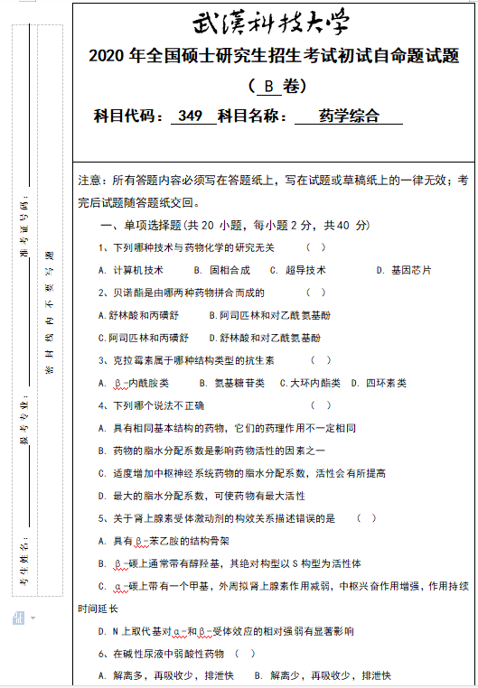 拼搏在线官网真题:武汉科技拼搏(中国)349药学综合2020年硕士研究生招生考试初试自命题试题