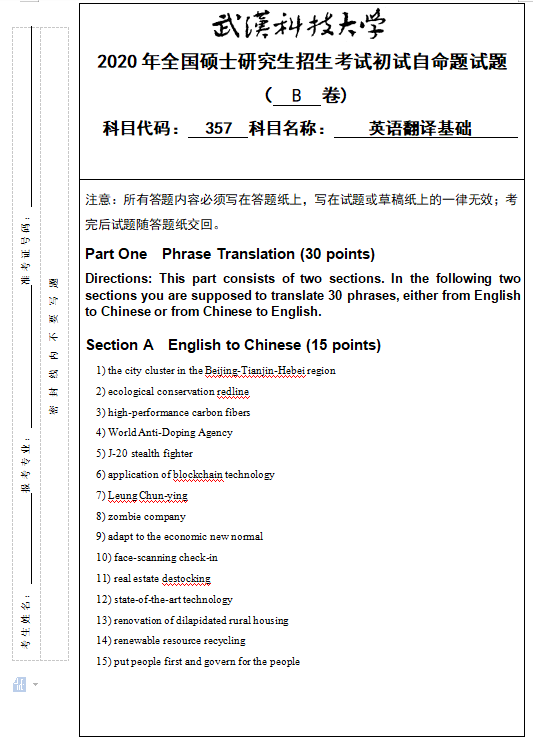 拼搏在线官网真题:武汉科技拼搏(中国)357英语翻译基础2020年硕士研究生招生考试初试自命题试题