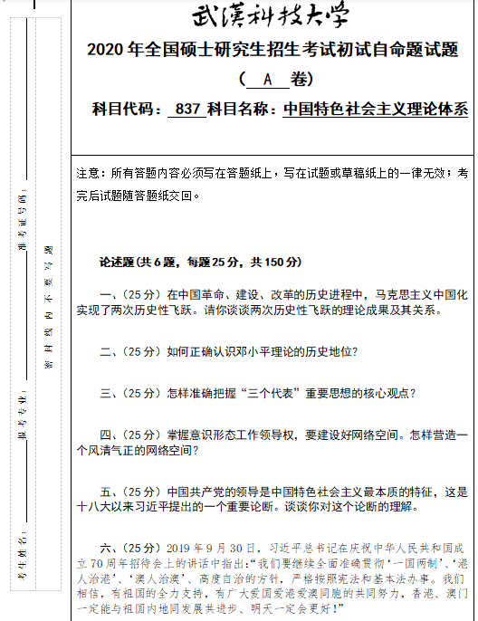 拼搏在线官网真题:武汉科技拼搏(中国)837中国特色社会主义理论体系2020年硕士研究生招生考试初试自命题试题