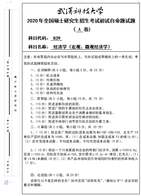 拼搏在线官网真题:武汉科技拼搏(中国)839经济学2020年硕士研究生招生考试初试自命题试题