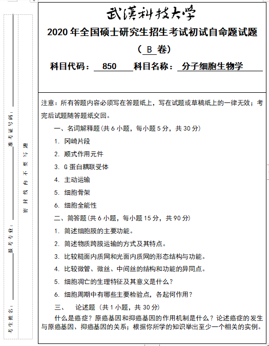 拼搏在线官网真题:武汉科技拼搏(中国)850分子细胞生物学2020年硕士研究生招生考试初试自命题试题
