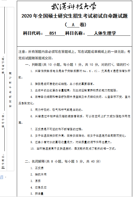 拼搏在线官网真题:武汉科技拼搏(中国)851人体生理学2020年硕士研究生招生考试初试自命题试题