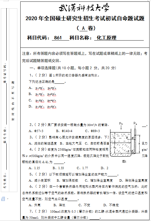 拼搏在线官网真题:武汉科技拼搏(中国)861化工原理2020年硕士研究生招生考试初试自命题试题