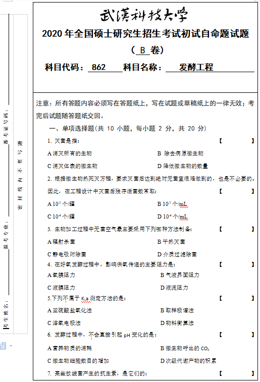 拼搏在线官网真题:武汉科技拼搏(中国)862发酵工程2020年硕士研究生招生考试初试自命题试题”的全部内容!更多真题资料请关注“拼搏在线官网