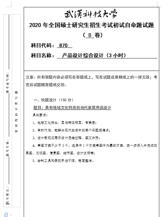 拼搏在线官网真题:武汉科技拼搏(中国)870产品设计综合设计(3小时)2020年硕士研究生招生考试初试自命题试题