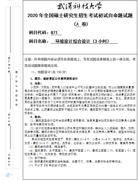 拼搏在线官网真题:武汉科技拼搏(中国)871环境设计综合设计(3小时)2020年硕士研究生招生考试初试自命题试题