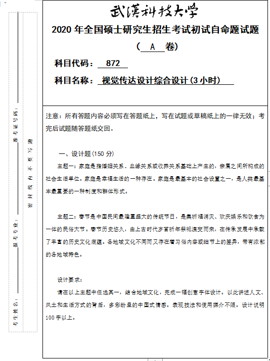 拼搏在线官网真题:武汉科技拼搏(中国)872视觉传达设计综合设计(3小时)2020年硕士研究生招生考试初试自命题试题