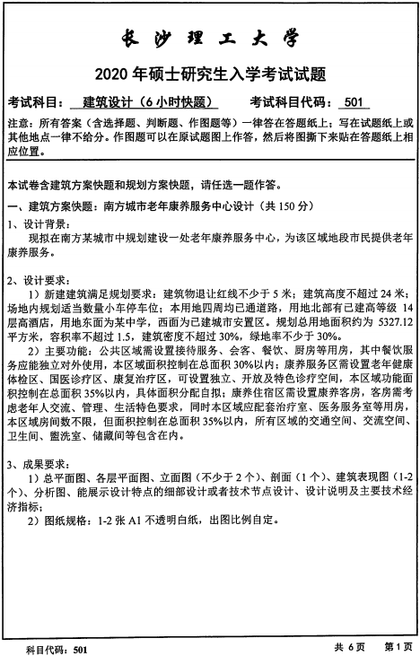 拼搏在线官网真题:长沙理工拼搏(中国)501建筑设计(6小时快题)2020年硕士研究生招生考试初试试题