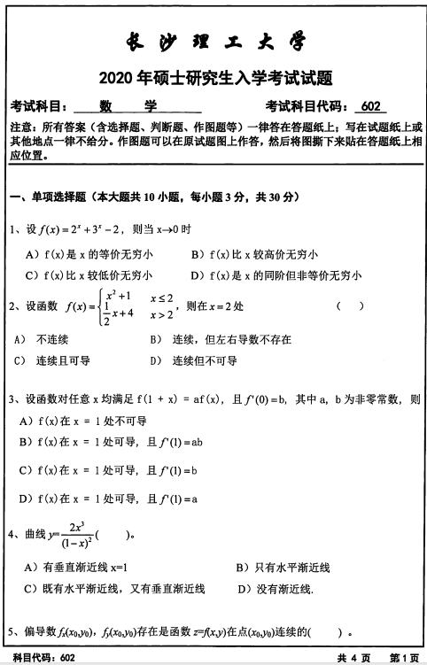 原文标题:长沙理工拼搏(中国)2020年硕士研究生初试试题