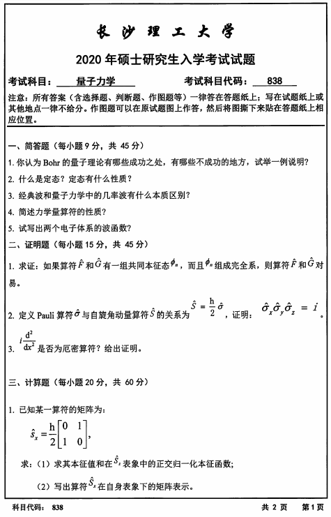 以上就是小编整理的“拼搏在线官网真题:长沙理工拼搏(中国)838量子力学2020年硕士研究生招生考试初试试题”的全部内容!更多真题资料请关注“拼搏在线官网专业课真题”栏目!祝拼搏在线官网成功!