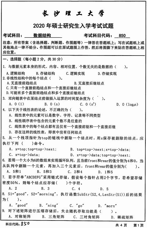 以上就是小编整理的“拼搏在线官网真题:长沙理工拼搏(中国)850数据结构2020年硕士研究生招生考试初试试题”的全部内容!更多真题资料请关注“拼搏在线官网专业课真题”栏目!祝拼搏在线官网成功!