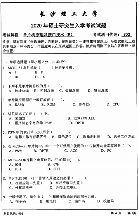 拼搏在线官网真题:长沙理工拼搏(中国)902单片机原理及接口技术(B)2020年硕士研究生招生考试初试试题