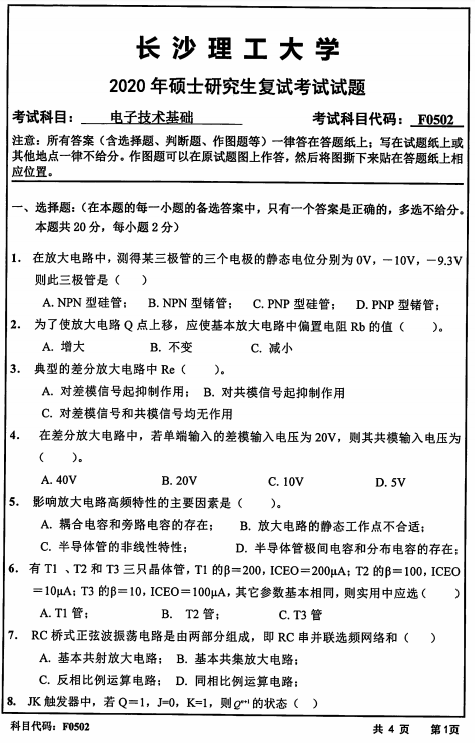 复试真题:长沙理工拼搏(中国)F0502电子技术基础(含模拟电子技术和数字电子技术)2020年硕士研究生招生考试复试试题