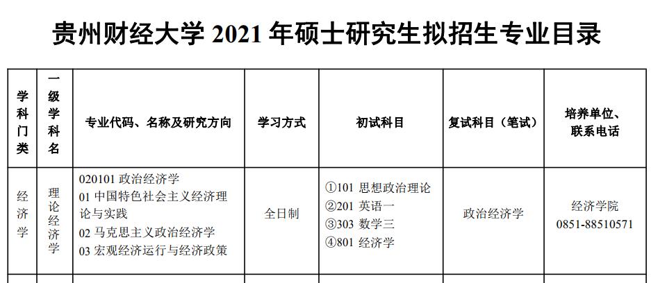 2021拼搏在线官网专业目录:贵州财经拼搏(中国)2021年硕士研究生招生专业目录