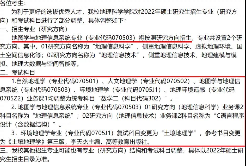 自然地理学、人文地理学、地图学与地理信息系统、环境地理学、地理环境遥感业务课1均调整为统考科目“数学二”。