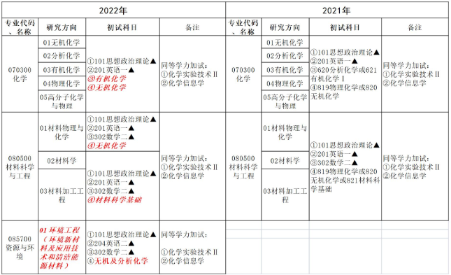 根据研究生培养需要,我院化学、材料科学与工程、资源与环境专业2022年硕士研究生招生初试科目及报考条件调整如下: