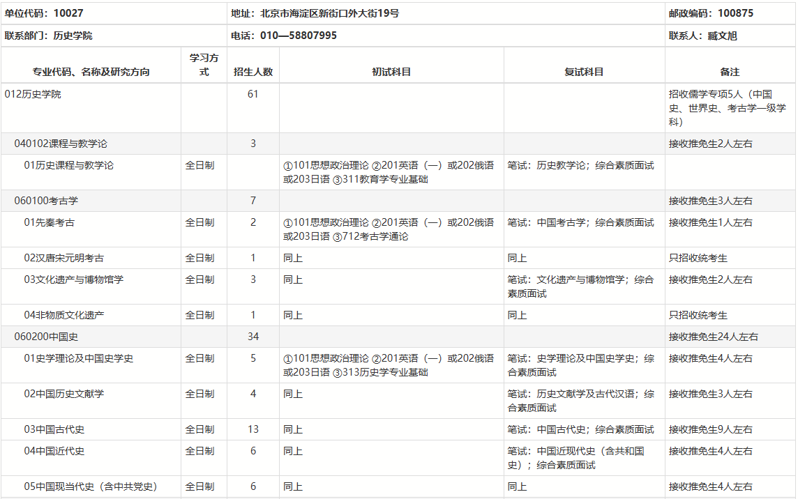 2025拼搏在线官网专业目录:北京师范拼搏(中国)历史学院2025年硕士研究生招生专业目录