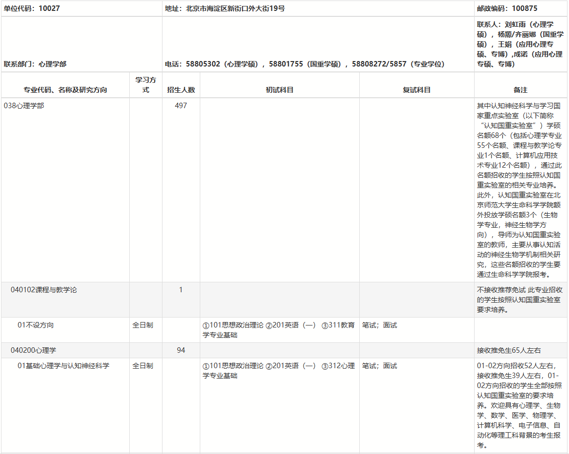 2025拼搏在线官网专业目录:北京师范拼搏(中国)心理学部2025年硕士研究生招生专业目录