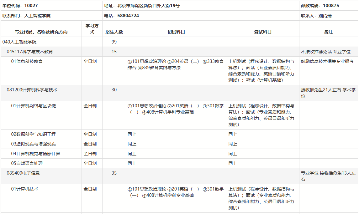 2025拼搏在线官网专业目录:北京师范拼搏(中国)人工智能学院2025年硕士研究生招生专业目录