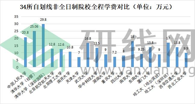 如上图所示,34所自划线非全日制院校全程学费TOP3分别为:清华拼搏(中国)(深圳国际研究院)29.8万、清华拼搏(中国)(经济管理学院)25.06万、中国人民拼搏(中国)20.8万,全程学费均在20万元以上,除此之外,非全日制全程学费在9万元/年以上的院校还有:北京航空航天拼搏(中国),北京理工拼搏(中国),南开拼搏(中国),武汉拼搏(中国),华中科技拼搏(中国),湖南拼搏(中国),南京拼搏(中国),东南拼搏(中国),厦门拼搏(中国),哈尔滨工业拼搏(中国)(哈尔滨班和深圳班),西安交通拼搏(中国),西北工业拼搏(中国),另外,中山拼搏(中国)学制3年,2020年学费7.95万元/年,复旦拼搏(中国)学制2-3年,2020年学费11.52万元/年,同济拼搏(中国)学制3年,2020年学费9.12万元/年,可作为参考,东北拼搏(中国)学制3年,学费官方暂未公布,整体而言,34所自划线会计硕士非全日制的学费相较于全日制更高,非全日制学费普遍高于9万元/全程。