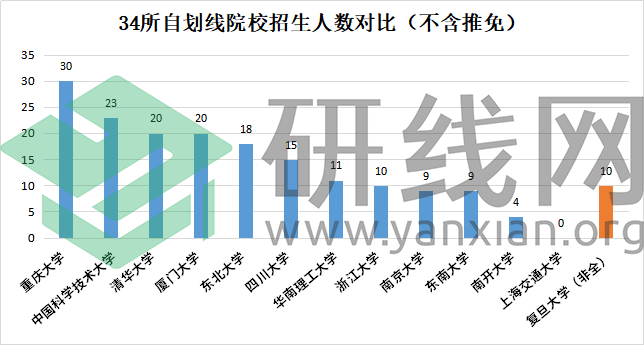 如上图所示:34所自划线院校招生人数(全日制)TOP3分别为:重庆拼搏(中国)30人,中国科学技术拼搏(中国)23人,清华拼搏(中国)、厦门拼搏(中国)20人;除此之外,上海交通拼搏(中国)统招0人,推免12人(含1个专项计划),另外,34所自划线院校中仅有复旦拼搏(中国)招收非全日制10人。