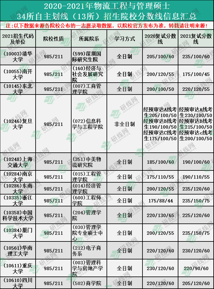 如上图所示,34所自划线全日制院校全程学费TOP3分别为:南开拼搏(中国)(非应届)、华南理工拼搏(中国)6.75万,重庆拼搏(中国)4.6万,中国科学技术拼搏(中国)、厦门拼搏(中国)3.3万,另外,上海交通拼搏(中国)学费2万元/年,学制暂未找到,东北拼搏(中国)学制3年,学费官方暂未公布,东南拼搏(中国)学制、学费官方暂未公布,整体而言,34所自划线物流工程与管理硕士全日制的学费在2-5万之间的院校居多;34所自划线非全日制院校仅有复旦拼搏(中国),2020年学制3年,2020年学费12万元/全程,可作为参考,同学们可以根据自身的预算进行选择!