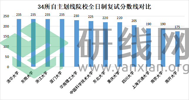 如上图所示:2021年34所自主划线院校全日制招生复试线TOP4分别为清华拼搏(中国)235、东南拼搏(中国)235、浙江拼搏(中国)235以及厦门拼搏(中国)235,除南开拼搏(中国)175、南京拼搏(中国)190、上海交通拼搏(中国)190,其余9所院校全日制复试分数线均在200以上,分数段在200-220的院校有3所,在221-230的院校有2所,在231分以上的院校有4所。总体来说,自主划线院校的全日制复试分数线较高!