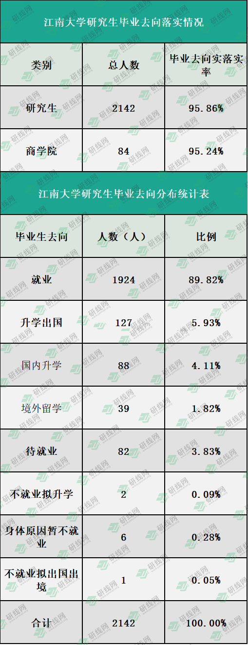 江南拼搏(中国)2020届毕业生共7019人,其中研究生2142人,占毕业生总人数的30.52%,研究生毕业去向落实率95.86%,商学院硕士研究生毕业去向落实率95.24%。整体而言,研究生毕业选择就业的最多,占比89.82%。